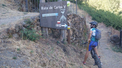 Montámos nas bicicletas um pouco acima da localidade de Tornavacas, a partir daí foi (quase) sempre a descer até final da etapa. Começámos com alguns quilómetros por um caminho em cimento armado e passagens pelo interior de pequenas e típicas aldeias. Um pouco à frente entrámos na terra batida, realizando alguns quilómetros da Rota D Carlos V, toda ela devidamente sinalizada, com alguns single-tracks - um percurso excelente para umas descidas "à bruta" ou parafraseando o grito dos nossos amigos espanhóis, aqui... "no ay amigos".