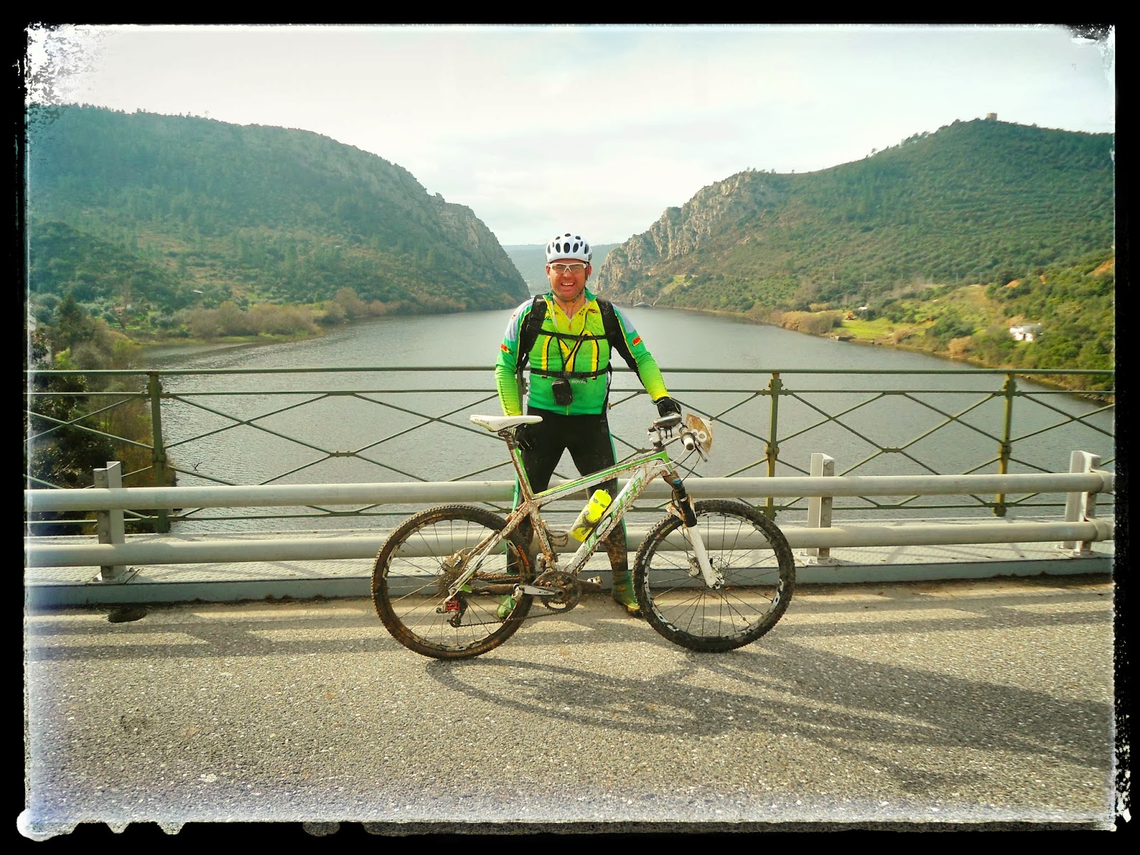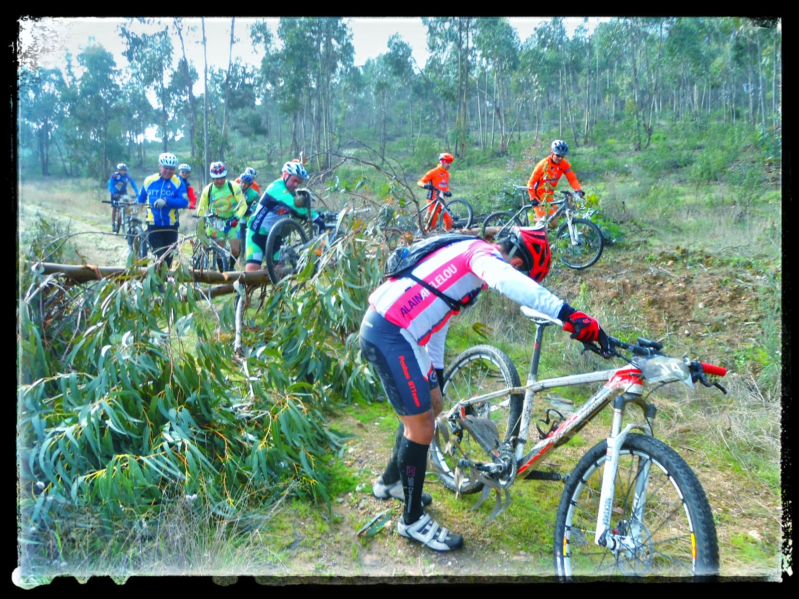 Mais uma passagem sobre uma linha de água, desta feita junto a uma pequena represa. Nesta que foi a minha primeira participação num evento em 2014, estreei-me igualmente a cair, um pouco mais à frente do local da foto, felizmente sem estragos na bike ou mazelas no corpo. Deu-se quando me preparava para ultrapassar um estreito regato que cruzava o trilho, porém a água não deixava transparecer que era profundo e a roda da frente prendeu de imediato fazendo-me voar sobre o guiador. Escassos segundos antes havia visto uns metros mais à frente na extensa fila de bttistas, um outro participante cometer o mesmo erro, mas não me precavi quando deveria ter sacado um cavalo para passar em segurança.